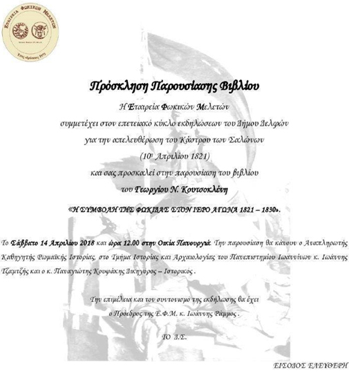 Παρουσίαση Βιβλίου Γ. Ν. Κουτσοκλένη «Η ΣΥΜΒΟΛΗ ΤΗΣ ΦΩΚΙΔΑΣ ΣΤΟΝ ΙΕΡΟ ΑΓΩΝΑ 1821-1830»